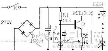 本文先從采用恒流源的電路開始,本電路中的主要元件三極管,要求其耐壓要400V以上,功率也要10W以上的大功率管,如MJE13003、MJE13005等,并且要加上散熱片,濾波電容C容量為4.7uF,耐壓要有400V以上,發(fā)光管電流的大小由R2調(diào)整決定,為方便調(diào)整可用可變電阻調(diào)整后再換上相同阻值的固定電阻,本電路可帶發(fā)光管數(shù)量少則十幾只,最多可達到90多只,雖然增加了一些成本,但使用效果要比只用電阻限流的電路好得多,即使電壓波動較大,電路仍然能保持電流恒定不變,這對發(fā)光管的壽命是非常有利的,在此范圍內(nèi)的電流都能基本保持恒定不變。本電路使用發(fā)光管數(shù)量也不可太少,越少其效率也越低。本電路總耗電功率約6W。
