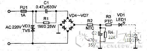 由于電容降壓電源是一種非隔離式電源,在通電瞬間會產(chǎn)生很大的電流,也就是所謂的浪涌電流。此外,由于外界環(huán)境的影響(如雷擊) 電網(wǎng)系統(tǒng)會侵入各種浪涌信號,有些浪涌會導致LED的損壞。所以,要提供熱敏電阻保護,這個主要有負溫度系數(shù)熱敏電阻保護(NTC熱敏電阻,NTC是Negative Temperature Coefficient的縮寫)和正溫度系數(shù)熱敏電阻保護(PTC(Positive Temperature Coefficient))然后有瞬態(tài)電壓抑制器保護((Transient Voltage Suppressor),簡稱TVS)