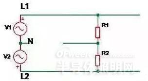如上圖所示,V1 表示第一相電壓,V2表示第二相電壓,R1 及 R2 分別表示正常安裝到線路中的 LED 驅(qū)動器。當線路上零線(N)如圖斷開時,兩個支路上的驅(qū)動器 R1,R2 相當于串聯(lián)后接到 380Vac 電壓上。因為輸入內(nèi)阻差異,當其中一個驅(qū)動器充電到啟動時,內(nèi)阻變小,電壓可能大部分加到另外一個驅(qū)動器上,導致其過壓損壞失效。