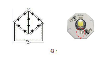 AC LED可分為兩類:一類是由單芯片封裝,芯片上多有個(gè)LED單元串聯(lián),并利用部分LED單元組成整流路,實(shí)現(xiàn)交流發(fā)光。參見圖一。