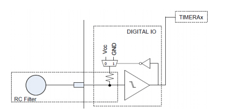 MSP430根據(jù)型號的不同支持多種電容觸摸檢測方式,有RC 震蕩、比較器、PIN RO,本設(shè)計使用的是PIN Relaxation Oscillator 方式,原理如圖,芯片管腳內(nèi)部檢測電路由施密特觸發(fā)器、反向器,以及一個電阻組成,震蕩信號經(jīng)過施密特觸發(fā)器變成脈沖信號,再通過反向器反饋回RC 電路,通過Timer_A對施密特觸發(fā)器的輸出進(jìn)行記數(shù),再通過設(shè)置測量窗口Gate 獲得記數(shù)的結(jié)果。當(dāng)手指觸摸電極,電極上的C 產(chǎn)生變化,導(dǎo)致震蕩頻率改變,這樣在定長的測量窗口就能獲得不同的記數(shù)結(jié)果,一旦差值超過門限,結(jié)合一定的濾波算法判斷就可以觸發(fā)觸摸事件。