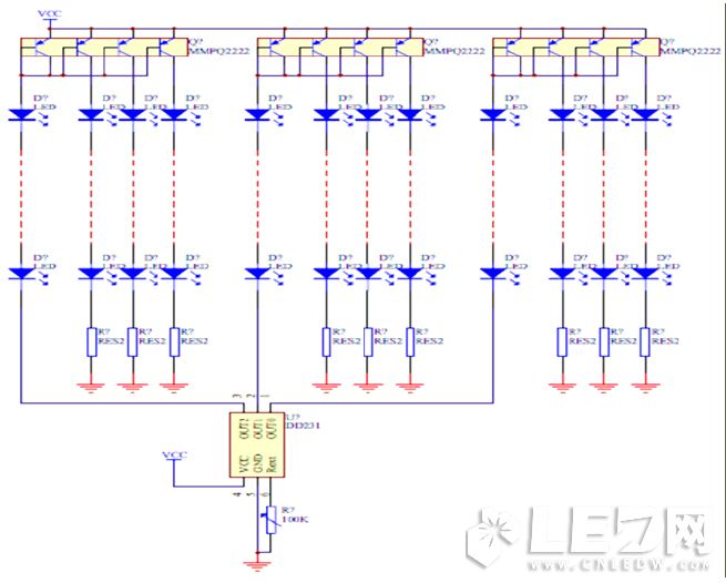 下圖采用集成三極管可以保持每路LED電流一致,這些三極管在相同溫度環(huán)境下、相同工藝條件生產(chǎn)出來的β值一樣,可以保證每路電流基本一樣。恒流部分在要求不是很高的條件下可以這樣設(shè)計,穩(wěn)定的電壓或穩(wěn)定的PWM伏值驅(qū)動穩(wěn)壓后的三極管偏壓,做到基本恒流。