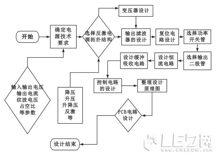 如同開關(guān)電源設(shè)計一樣,LED凈化燈驅(qū)動反激電源也是先進行總體考慮,然后對電源各部分分別進行設(shè)計,接下來就是設(shè)計總體和輔助功能,最后進行測試和設(shè)計優(yōu)化的。下面設(shè)計步驟流程: