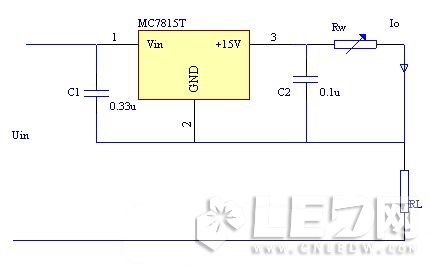 恒流輸出電路是采用集成穩(wěn)壓器構(gòu)成的開關(guān)恒流源電路構(gòu)成如下圖所示。MC7815為三端固定式集成穩(wěn)壓器,RL為LED二極管負載電阻,RW為可調(diào)電阻器。