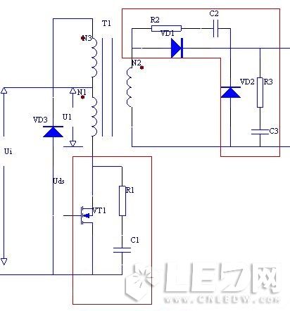 在開關(guān)電源中,由于變壓器的漏感、布線的引線電感存在、開關(guān)管在關(guān)斷瞬間會產(chǎn)生很高的電壓尖峰脈沖。整流快速恢復(fù)二極管由于存在存儲效應(yīng),反向恢復(fù)過程中也會出現(xiàn)很高的反向恢復(fù)的碾壓尖峰脈沖。這些過電壓尖峰脈沖的出現(xiàn)不但危及功率器件的工作安全性,而且形成很強的電磁干擾噪聲。為此必須在功率器件兩端設(shè)計尖峰電壓緩沖吸收電路。緩沖電路圖如圖中紅框部分: