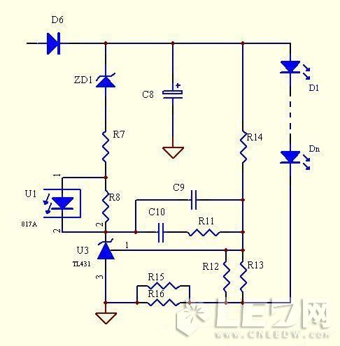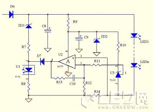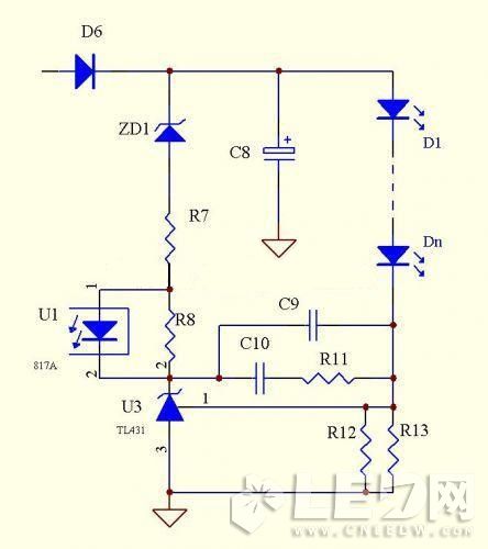 原理:此電路同樣是利用了TL431的2.495V的基準(zhǔn)來做恒流,跟上面的電路不同點(diǎn)在于減少了電流取樣電路的電壓,只要合計(jì)設(shè)計(jì)R12,R13,R14的值,可以限制LED上面的壓降.