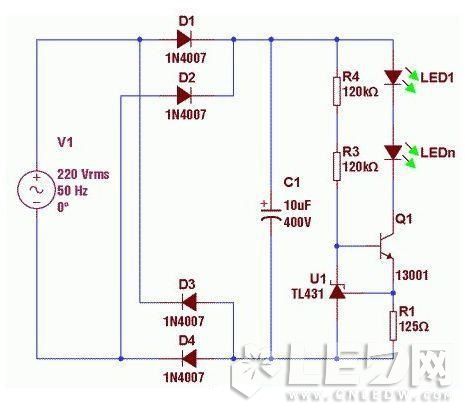 如上圖,即是利用單個TL431恒流的示意圖。這種電路的原理非常簡單,主要利用了431的2.495V的基準(zhǔn)來做恒流,并且同樣限制了LED上面的壓降,但優(yōu)點(diǎn)與缺點(diǎn)同樣明顯。