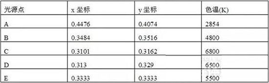 對(duì)于三原色紅(R)、綠(G)、藍(lán)(B),x=R/(R+G+B),y=G/(R+G+B),z=(R+G+B)。由于x+y+z=1,所以只需給出x和y的值,就能唯一確定一種顏色,這就是通常所說的色度圖。若以若以x、y作為平面坐標(biāo)系,用比色實(shí)驗(yàn)法測出自然界中各種色彩的x、y值,并將其繪在該坐標(biāo)平面內(nèi),便可得到色度圖。該色度圖邊沿舌形曲線上的任一點(diǎn)都代表某一波長光的色調(diào),而曲線內(nèi)的任一點(diǎn)均表示人眼能看到的某一種混合光的顏色。其中,白光區(qū)域的特征點(diǎn)A.、B、C、D、E的色坐標(biāo)值的色溫度值見下表。